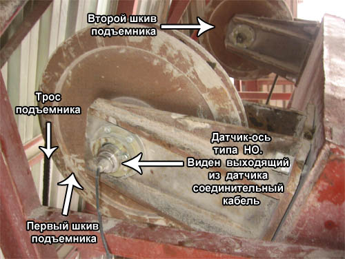 Для взвешивания  скипа штатные  оси  шкивов  подъемника были заменены на датчики  типа «Ось». В  этом случае  сила, измеряемая  датчиком,  пропорциональна  усилию  натяжения  троса, т.е.  весу  скипа.  Коэффициент  пропорциональности  зависит  также  от числа  тросов,  угла  охвата каждого  шкива  тросом,  и  учитывается  при  калибровке  системы.