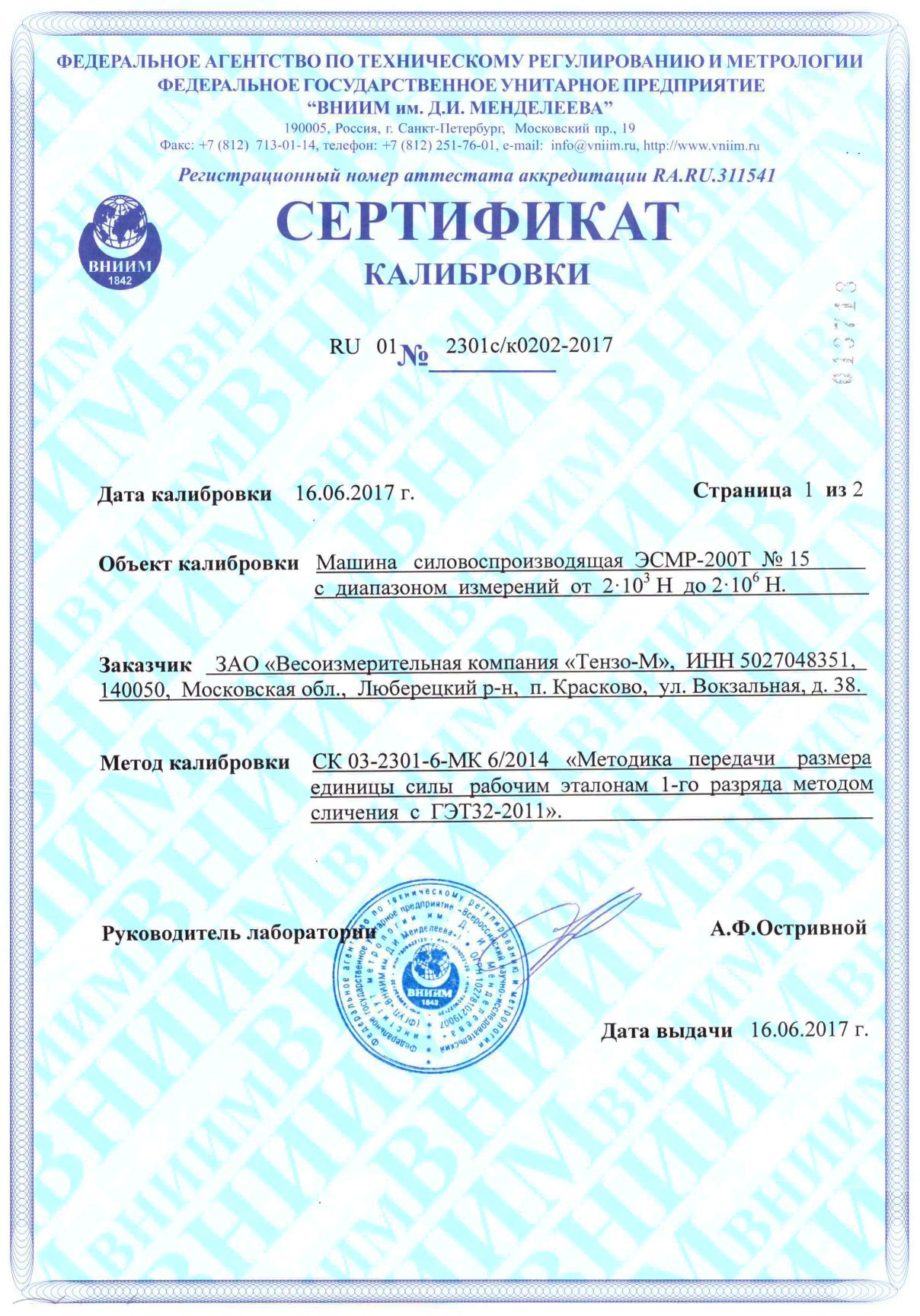 На днях произошло знаковое для «ТЕНЗО-М» событие – получен сертификат калибровки силовоспроизводящей машины ЭСМР-200Т №15 с диапазоном измерений от 2х103 до 2х106 Н. Калибровка машины выполнена с применением Государственного первичного эталона силы ГЭТ32-2011, что дало возможность аттестовать нашу машину согласно требованиям к эталонам 1-го разряда по ГОСТ 8.640-2014 «ГСИ. Государственная поверочная схема для средств измерения силы» со следующими метрологическими характеристиками: