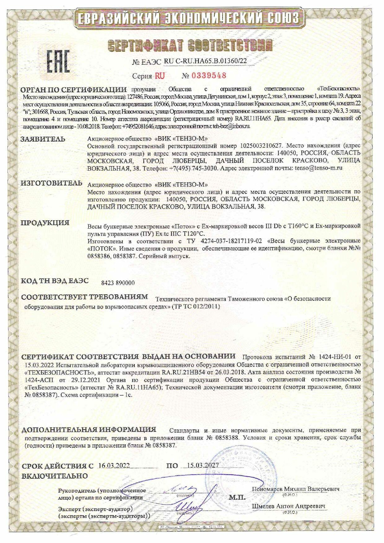 Получены сертификаты соответствия на бункерные весы и весовые дозаторы во взрывозащищенном исполнении