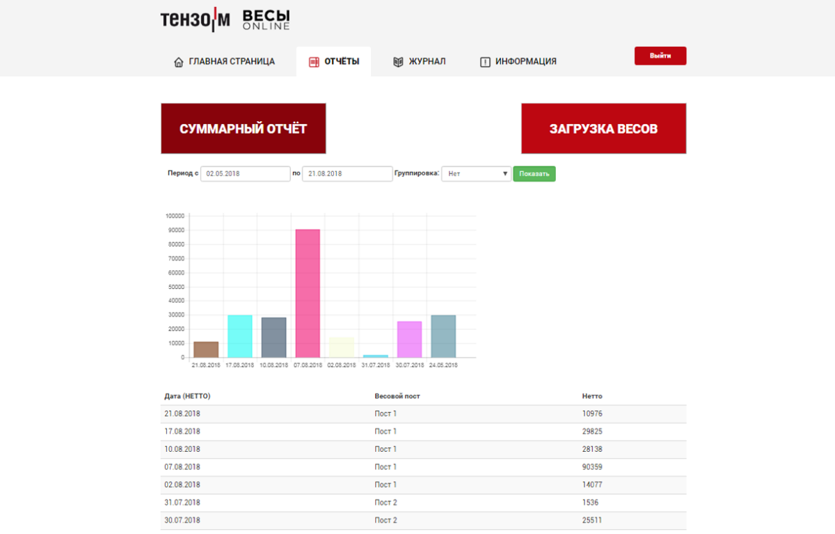 - Доступны графики отгрузки по нетто и загруженность весов по дням;